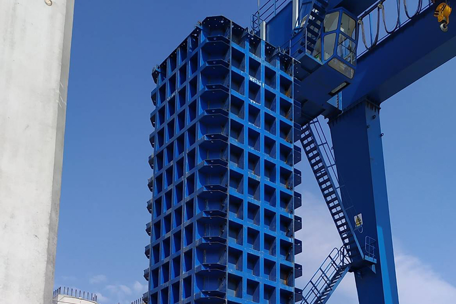 柱子是水平模制的,只有在极少数情况下,例如圆形柱子,才会使用垂直模具。立柱模具基本上由带有固定中心平台和可移动侧平台的模板底座组成。不同长度的模具部分可以单独操作,也可以通过整个长度上的连接板液压操作。使用一个可选的滑板,该滑板通过一个拉动机构连接到侧平台,脱模变得相当容易。在这种情况下,成品混凝土构件与地板模具一起搁置在滑板上,并在抬出之前与中心模具表面分离。柱模具也可用于生产基础基础的附加模具单元。预应力单元也可以集成用于生产预应力混凝土元件以及加热寄存器。为了压实混凝土,振动器安装在钢侧模板或侧框架网格上。